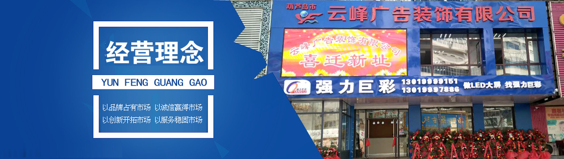 葫蘆島市云峰廣告裝飾有限公司自創(chuàng)立以來,一直致力于廣告牌的設(shè)計,噴繪,制作,安裝、LED工程、亮化工程、數(shù)碼圖文、圍擋制作安裝、三面翻廣告、大型擎天柱廣告、草坪牌、指示牌、雕刻背景墻、燈箱設(shè)計、標(biāo)識標(biāo)牌、金屬制品、亞克力字、展臺展柜、取款機隔斷、取款機隔斷等一體化服務(wù),是葫蘆島市噴繪行業(yè)大規(guī)模實業(yè)公司。